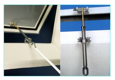 A clarabóia abre através de uma manivela tipo toldo, de 1,8 mts. Permite escolher o ângulo de abertura até um máximo de 30 cm. Não é aconselhável colocá-las a uma altura superior a 4 metros.