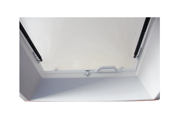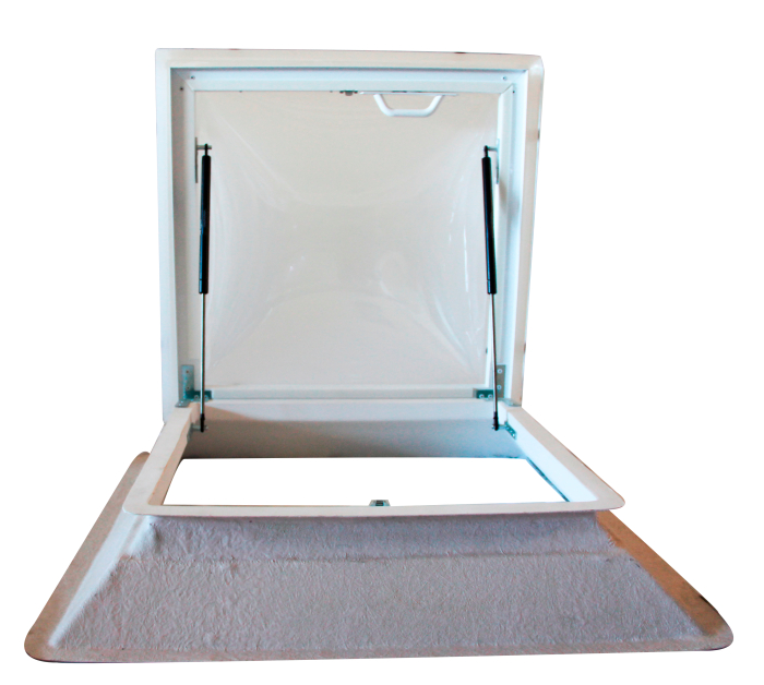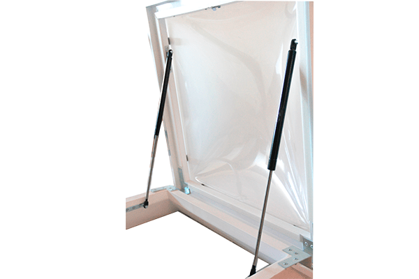 Sistema especialmente destinado a aplicações que necessitem de passagem para a cobertura desde o interior. Está dotado de um fecho no interior, para uma maior segurança. Conforme o tamanho da clarabóia, a sua abertura varia dos 70 aos 85 graus e é provida de um ou dois amortecedores.