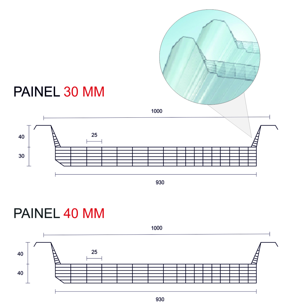 Chapas termopainel com ABA DUPLA em policarbonato compacto perfilado com 30 e 40 mm de espessura.