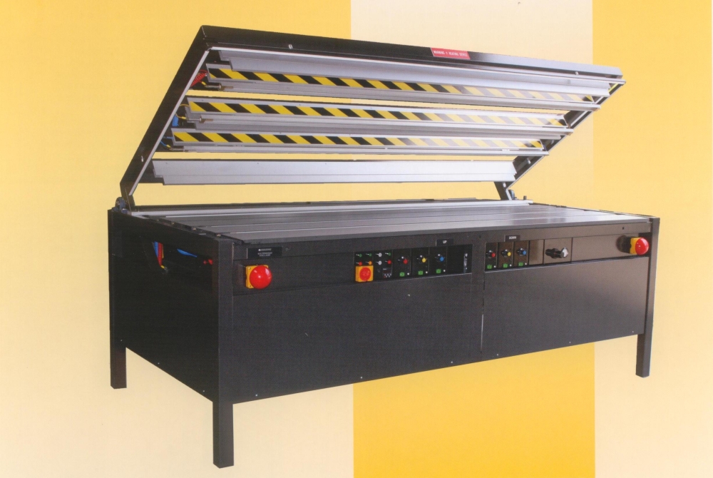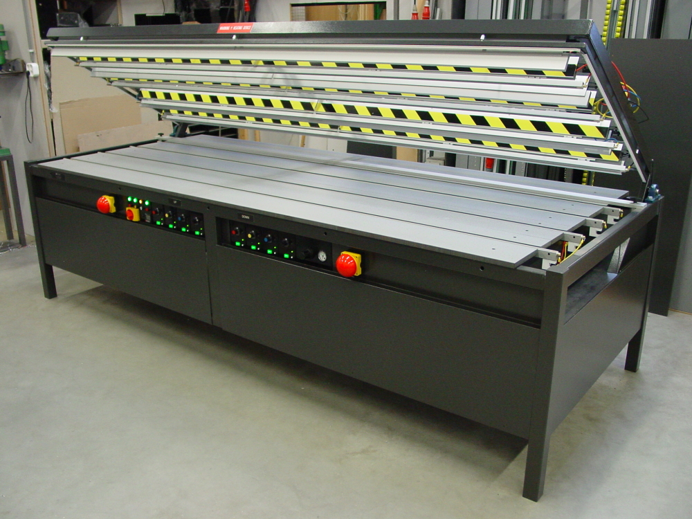 Máquina de dobrar plásticos profissional, equipada com resistências em baixo e refletores em cima (construção standard de duas resistências em baixo e dois refletores em cima. Outras construções também disponíveis).