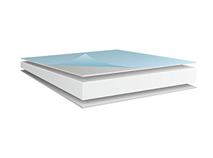 Painel leve composto por duas faces exteriores em PVC expandido de 1 mm e núcleo de poliestireno branco.